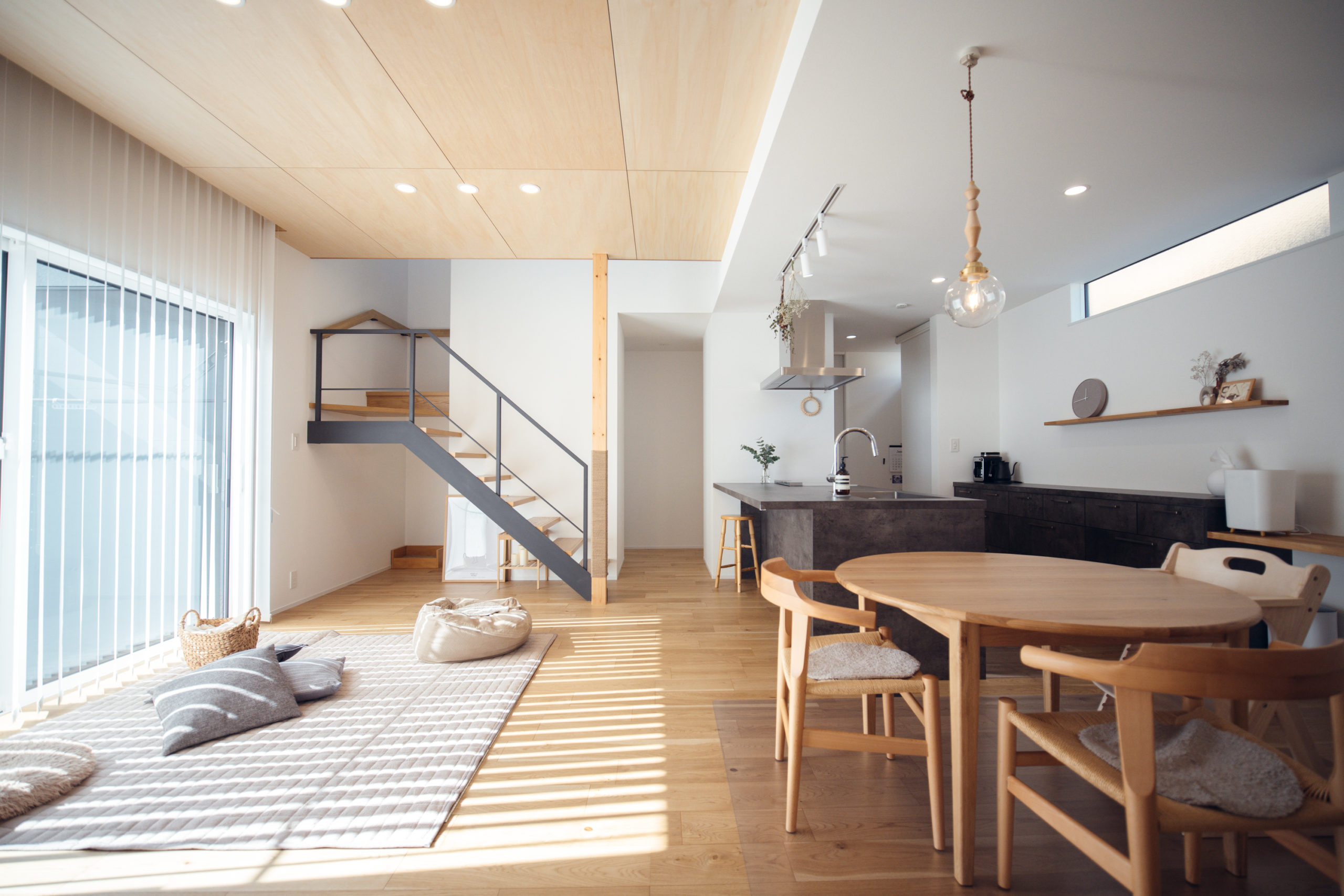 ペニンシュラ型のキッチンを採用し、リビングを通じて回遊が可能な間取りに。生活動線は直線的かつ効率的になるように設計しました。