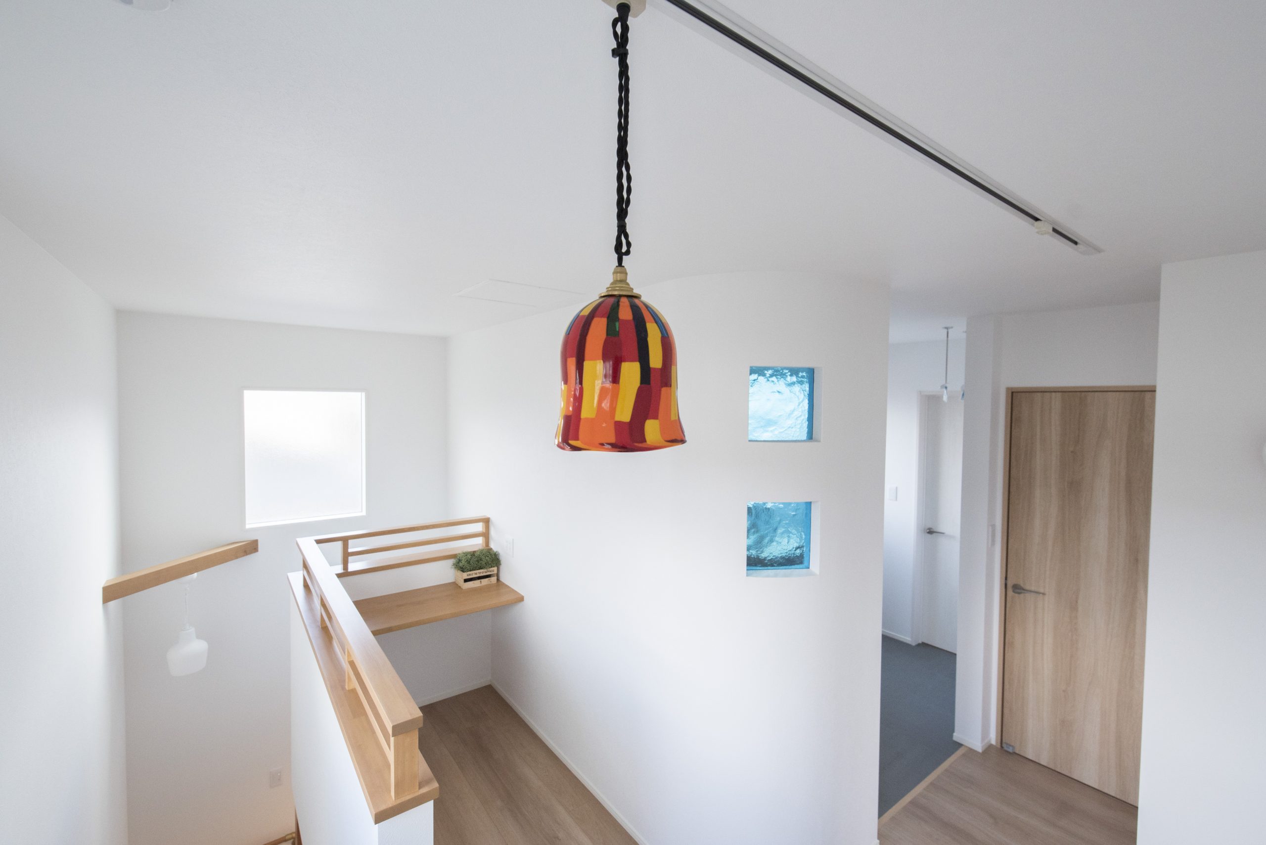 内観は木の温かみが感じられるよう白をベースにし、ご夫婦が長年かけて集めた照明や、R壁にはめ込んだ色ガラスが映えるステキなお家になりました。
