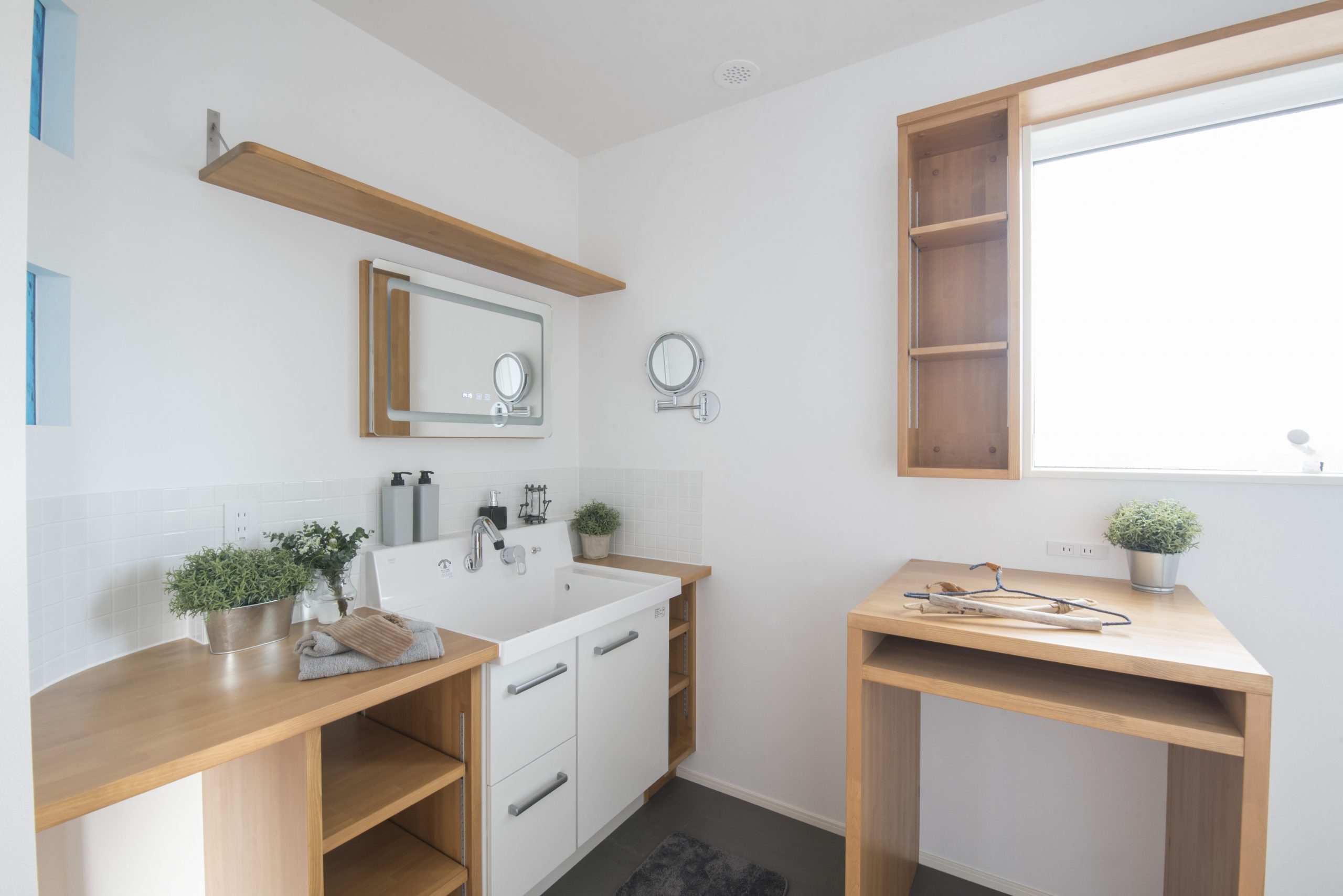 また、リビングの天井は梁を現しにする事で広々とした印象に、キッチン周りはゆとりを持たせた設計に加え、造作収納棚や隣にはパントリースペースと収納力も十分。2階にはユーティリティスペースがあり、家事動線も意識された作りに。