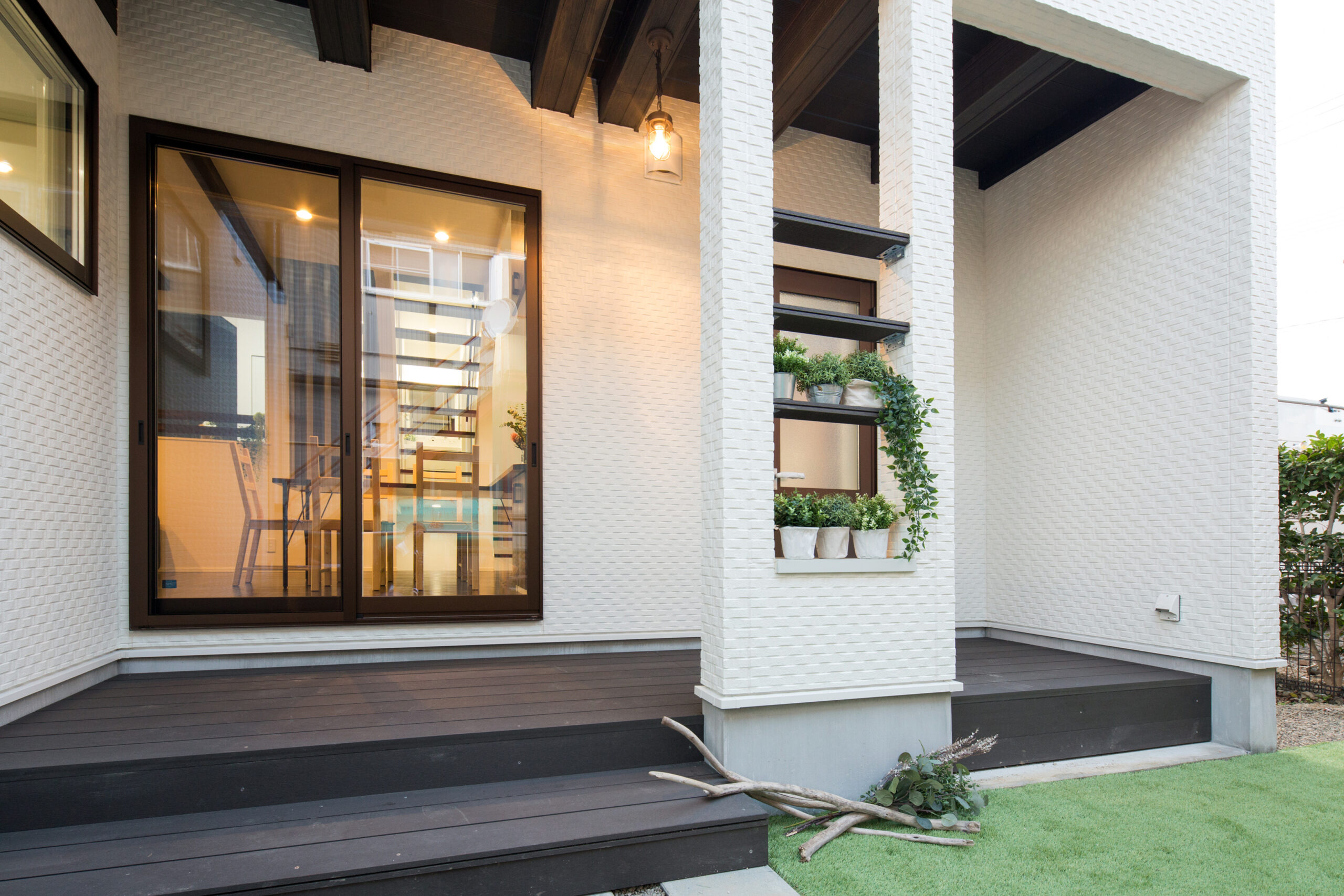 ホワイトと木目調ダークブラウンの2色を用いた、スクエア型のスタイリッシュな外観。ベランダやウッドデッキは、周囲からの視線が気にならない東面に配置しました。