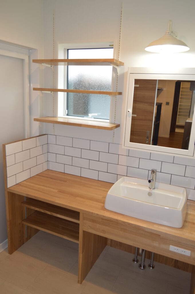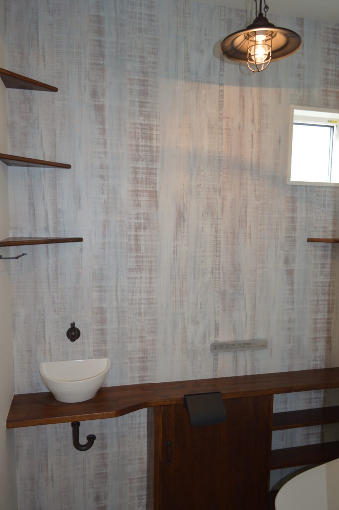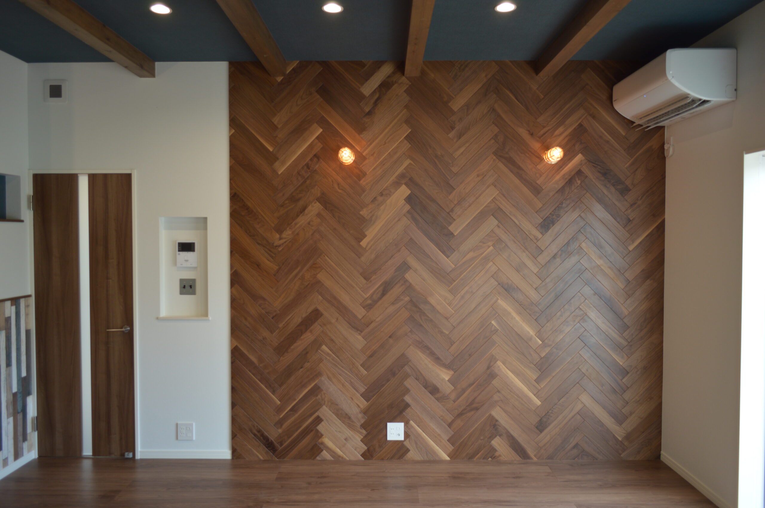 こだわりのヘリンボーンの壁や、板張り風のクロス、レトロな照明スイッチ、手作りの洗面台、ストリップ階段等、お家のすみずみまでお洒落に仕上がりました。
