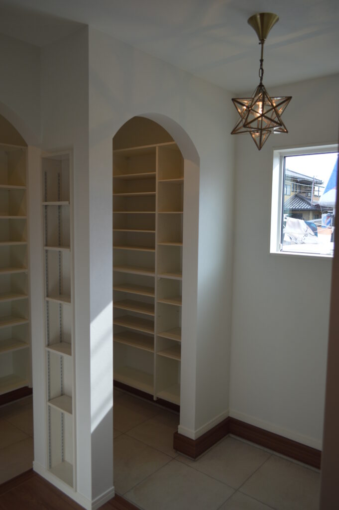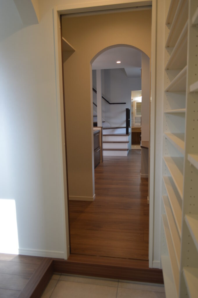 内装もこだわりたいけど、家事動線も重視したい!!を実現。玄関を入ると、シューズクローク→パントリー→キッチン→洗面脱衣所まで一直線で繋がっており、毎日の家事も楽々です♪